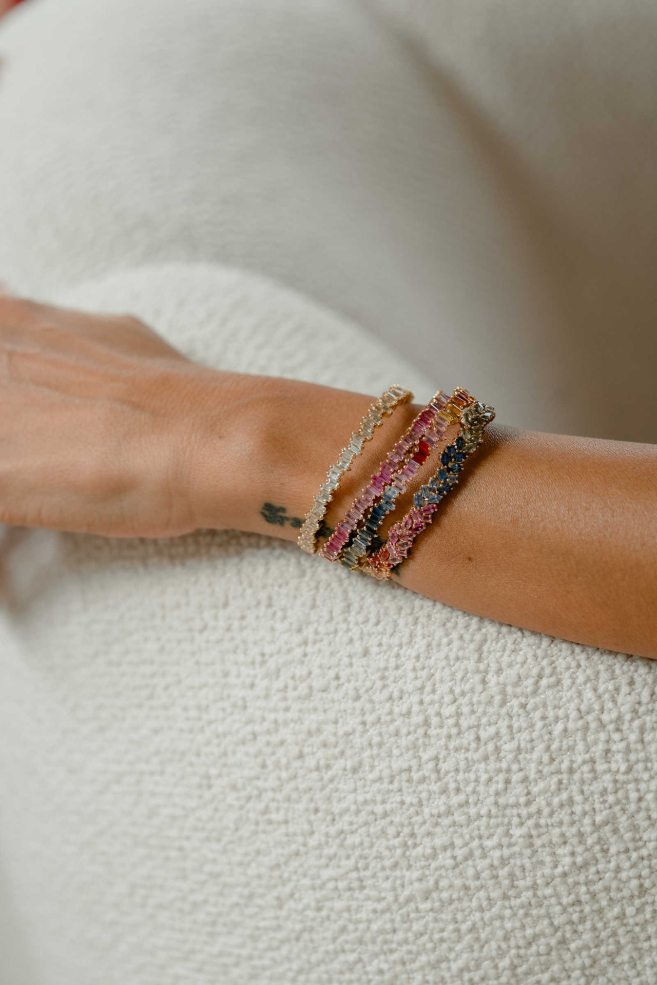 In 18K yellow gold set with white diamond baguettes. The Namib bracelet is a timeless elegant piece to be worn everyday, as a talisman, to protect one from negative vibes. Stack it up. Sizes available from 14 cm and up. As each bracelet is made upon order and hence unique, price may vary. Price available upon request. At first glance it appears to be a reinterpretation of the classic tennis diamond bracelet. Yet, upon closer inspection we see the sand dunes of the desert landscape in its contours. Diamonds are a symbol of eternal love and they provide us with clarity, and increase our inner strength.