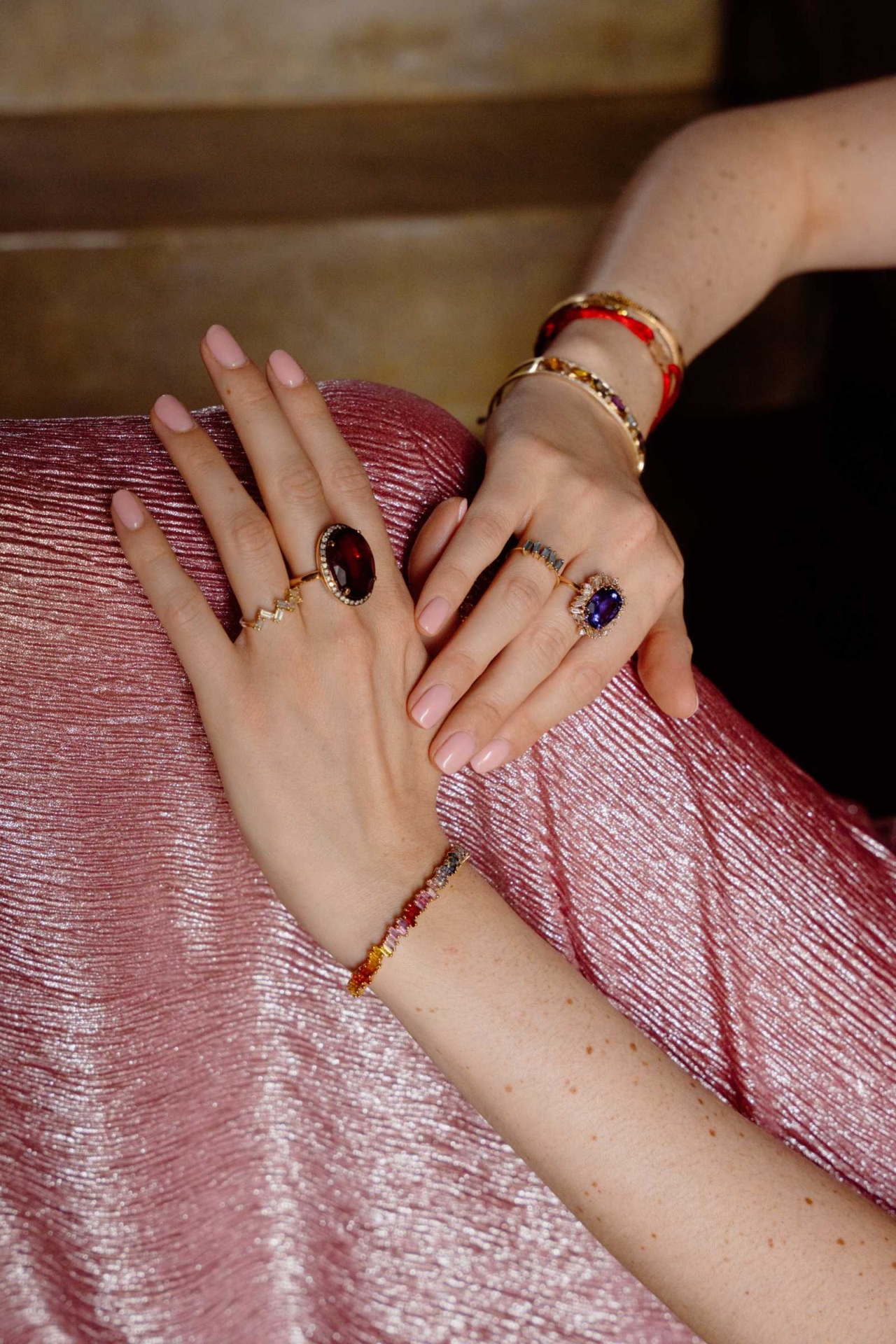 In 18K yellow gold set with multicolored sapphires baguettes. The Rainbow bracelet is a bold yet feminine piece to be worn everyday, as a talisman, providing one with good fortune and positive vibes. Sizes available from 14 cm and up. As each bracelet is made upon order and hence unique, price may vary. Price available upon request. The asymmetric form of the bracelet and the sapphires placed irregularly transport us to the dunes of the desert.