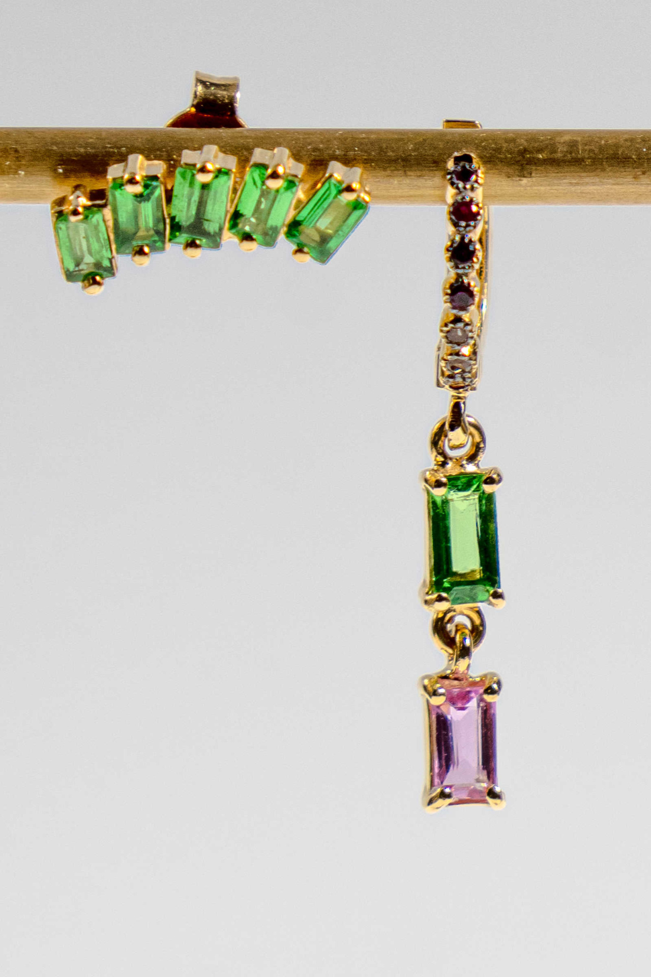 In 18K yellow gold mini hoop set with round orange sapphires and baguettes tsavorites.