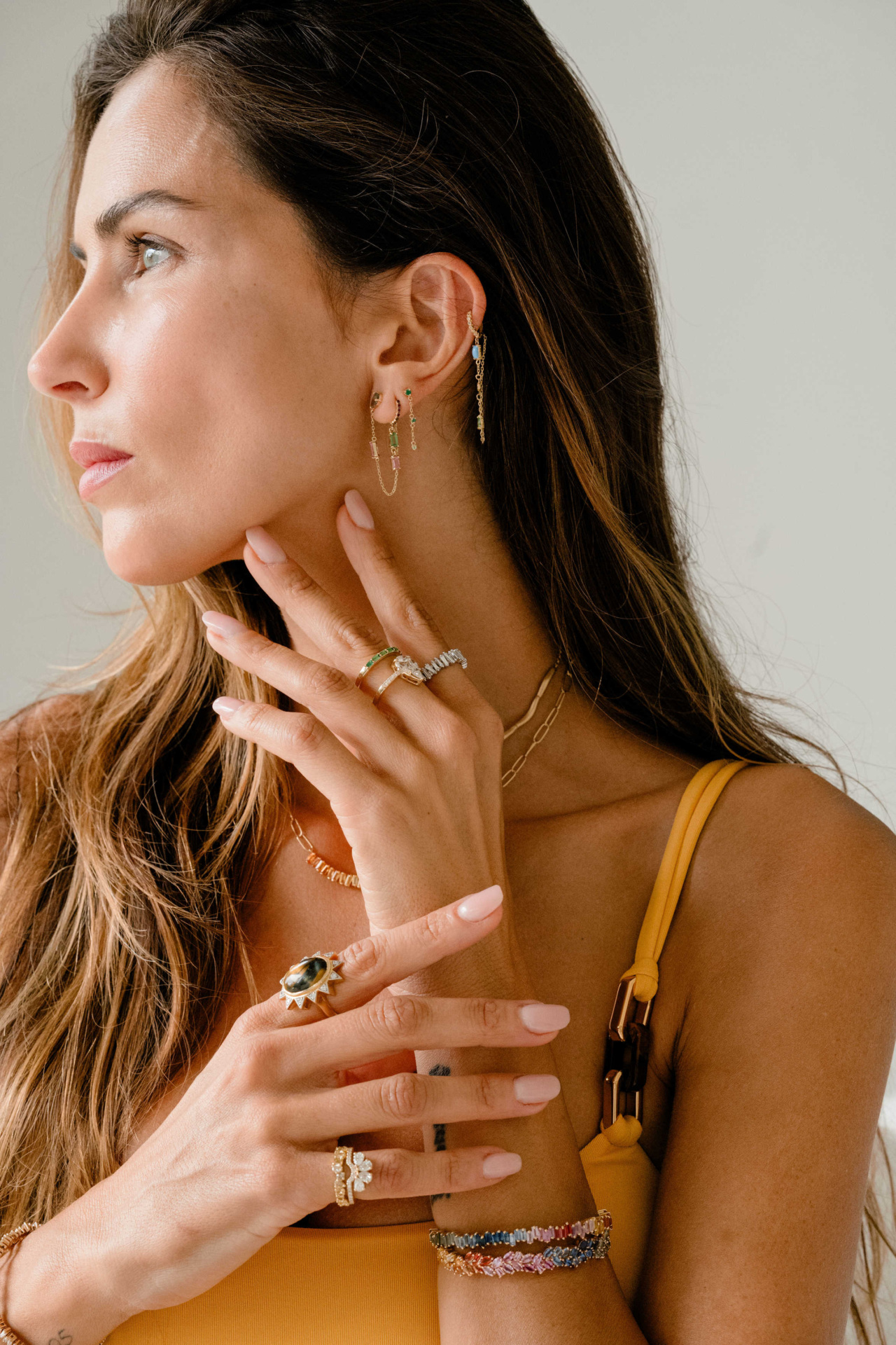 In 18K yellow gold mini hoop set with round white sapphires and a chain with a turquoise baguette, a round orange sapphite and a pear shaped tsavorite.