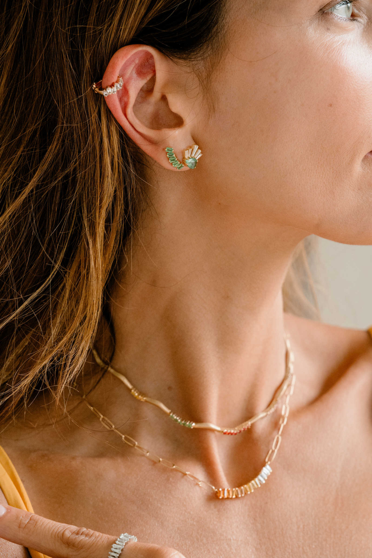 For a cohesive, green-inspired look, pair the Green Skies Earring with the Cactus Bracelet, the Artemis Necklace, or the Green Sky Reflection Earring. Embrace the effortless charm and enduring allure of these verdant gems, and let the desert’s quiet strength guide your style.