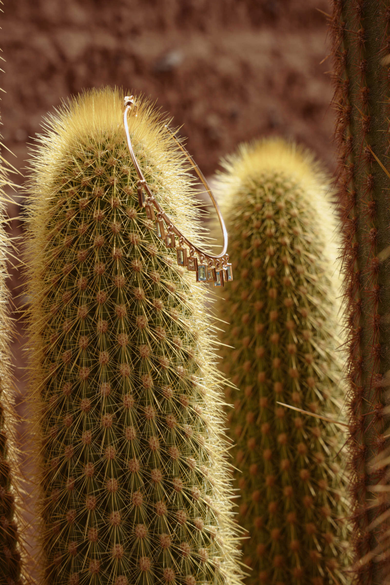 In 18K rose gold with dangling white sapphires and blue topaz baguettes.