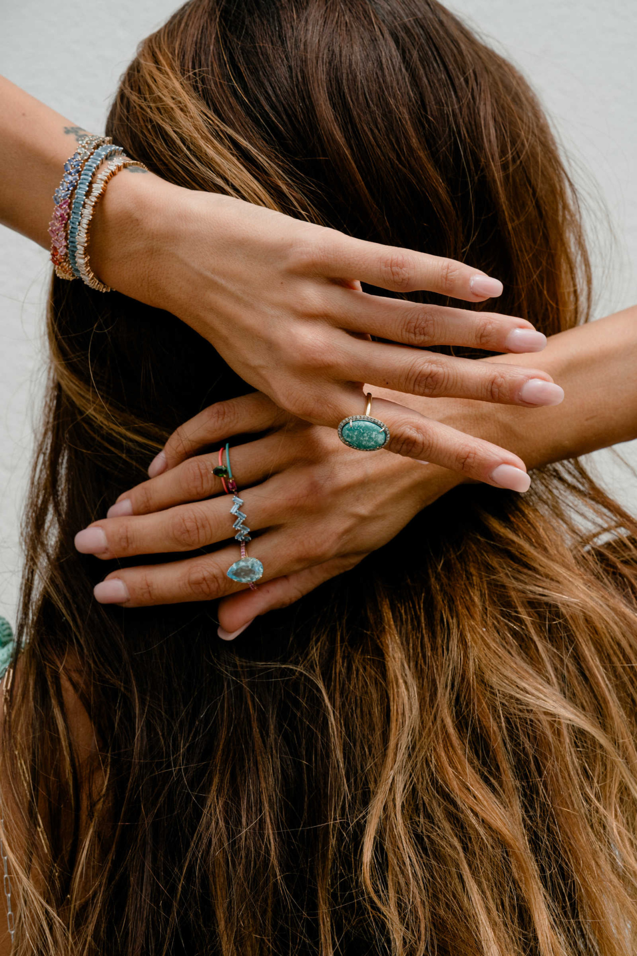 The Blue Reflections Ring is a one-of-a-kind piece in 18K white gold (approx. 3gr) set with blue baguette topaz (approx. 1 carats). This precious blue topaz ring evokes the enchantment of Mughal gardens, the beauty of the sky’s reflection in pools, and nature in its most simple forms. The color blue of the topaz is associated with the throat chakra, Vishuddha, and promotes clear communication and self-expression. Designed to be worn everyday and stackable, the Blue Reflections Ring is a powerful talisman. For a more sophisticated look pair it with the Infinite Sky Bracelet from the Desert Collection and the Chasing Skies Necklace from the Chain of Love Collection, two pieces also set with blue baguette topaz.