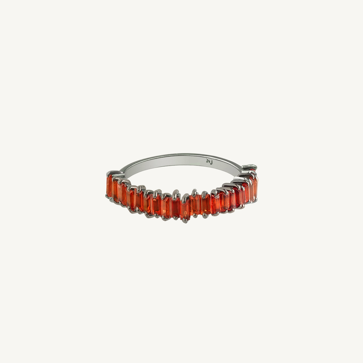 In 18K black rhodium gold plated half set with ruby baguettes. The Desert Red ring in black rhodium is a bold statement piece to be worn everyday, with a rock n’ roll attitude that will infuse one with confidence. As each ring is made upon order and hence unique, price may vary. Price available upon request. The Desert Red ring in black rhodium is an ode to the red dunes of the Sossuvlei desert in Namibia.The color red symbolizes courage, sacrifice and love and is associated with the root chakra, Muladhara.