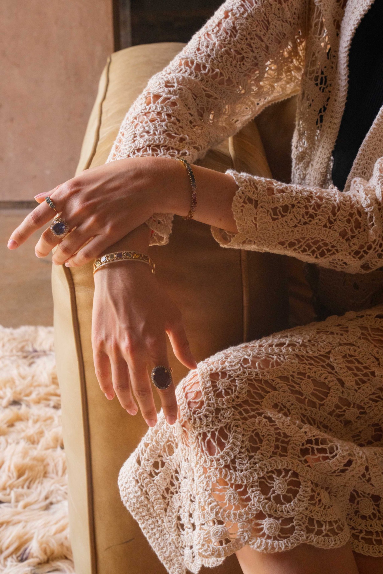 The Mini Cactus Shade Ring is an elegant 18K rose gold ring (approx. 1 gr) set with a trio of baguette sapphire in shades of green (approx. 0.6 carats). Designed to be worn every day and stackable, this rose gold ring is a talisman providing good fortune, positive energy and prosperity. Pair the Mini Cactus Shade Ring with other green sapphire pieces such as the Cactus Shade Bracelet from the Desert Collection or with the Banyan Green Ring from the Mughal Reverie Collection.