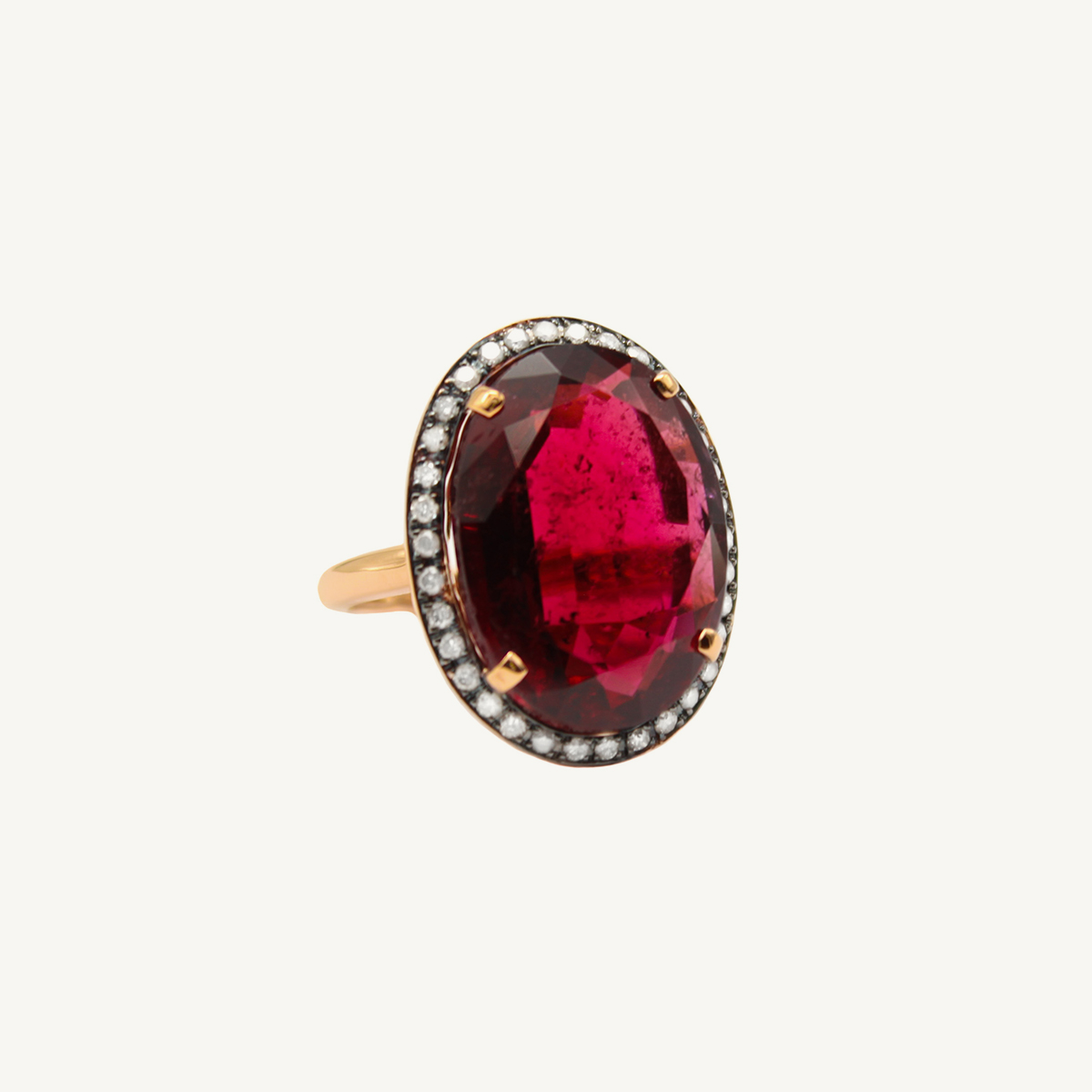 In 18K rose gold (approx. 13.8 gr), rubellite stone at the center (approx. 24.44 carats) contour in black rhodium gold plated, adorned with white diamonds (approx. 0.56 carats). A bold and timeless statement piece to be worn day and night, as a talisman, that will accompany you on your daily journey. The color red symbolizes courage and passion and is associated with the root chakra, Muladhara.